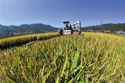 近日,湖北省襄阳市保康县水稻开镰收割,当地农民抢抓晴好天气收割水稻,田间地头一派繁忙景象。