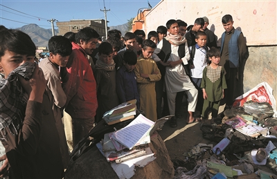 2021年5月9日,在阿富汗喀布尔,人们站在遇难学生的物品旁。前一天发生在喀布尔一所学校附近的爆炸袭击造成超过50人死亡,另有逾百人受伤。(资料图)