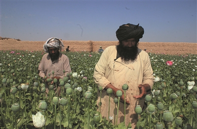 2019年4月4日,在阿富汗南部赫尔曼德省格里什克地区,阿富汗农民在罂粟田里劳作。(资料图)
