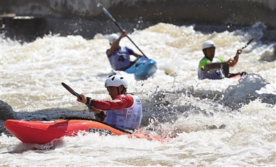 9月12日,在四川省攀枝花市米易县举行的第十四届全运会皮划艇激流回旋男子极限皮艇比赛中,福建队选手全鑫夺得金牌。图为福建队选手全鑫(前)在决赛中。