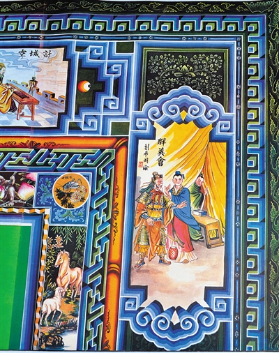 刘希明初中毕业后跟着一位老民间艺人学起了炕围画,“过去我们被称为画匠,立七坐五盘三半,一膀三庭、一手三拳,也是跟了师傅学习才知道哪里动笔、哪里收笔。”炕围画把民间故事、神话故事和名著情节展现,这些人物就有着传统画法的比例。说起画炕围画,刘希明便详细给记者介绍起来,处理墙面,刷上白底,画上边道和“池子”,在“池子”里画上花鸟鱼虫和山水人物,用胶矾水和清漆“封面”,精美的炕围画就完成了。“说起来很轻松,但这里还是有很多讲究的。”刘希明笑着说,“边道是勾连万字,它里面的‘池子’是炕围画的主要内容,而‘池子’也分‘主池子’和‘副池子’,我们一般在‘主池子’里画山水和人物,在‘副池子’里画花草和飞鸟。”