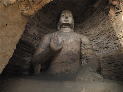 昙曜五窟是云冈石窟最早开凿的5个洞窟,第19窟是昙曜五窟中规模最大、形制组合最独特的洞窟,为穹窿顶大像窟,窟门向内收缩,为昙耀五窟中仅有的形制,三世佛分别安置于主窟和东西两个附窟耳洞中。第19窟主像呈吉祥式结跏趺坐像,高16.8米,是昙曜五窟中最大的佛像,也是云冈石窟第二大佛,佛像耳轮齐肩,面容慈祥,端庄稳静,气势凝重,左手微握拳,置膝上, 右手施无畏印,五指舒开上举当胸,肘下方有一石柱支撑。