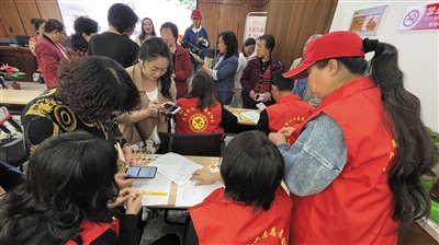 活动现场,志愿者们为前来的老人逐一做好登记,为他们讲解“黄手环”的使用方法、手指操的锻炼手法、如何预防阿尔兹海默症及老年人常见的5种疾病,志愿者还为老年人进行义诊。