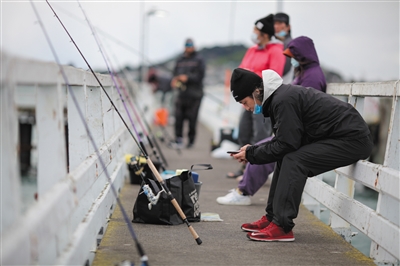 9月19日,在新西兰奥克兰东区使命湾一个码头,人们戴着口罩,保持距离一字排开钓鱼。