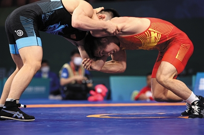 9月23日,在陕西延安进行的第十四届全运会摔跤项目男子自由式57公斤级决赛中,广西队选手刘明瑚击败队友邹万豪,获得冠军。图为广西队选手刘明瑚(右)与队友邹万豪在比赛中。