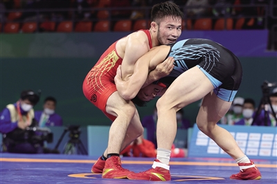 9月25日,新疆队选手托尔巴图(左)和湖北队选手谭浩东在比赛中。
