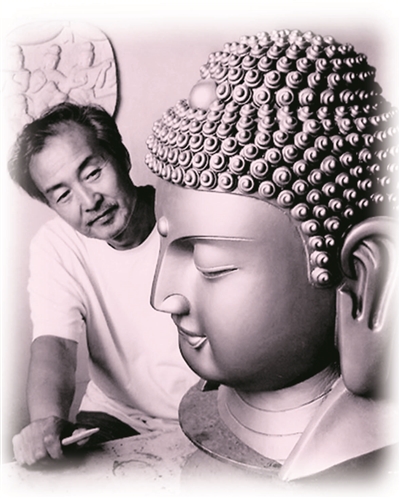 李老师雕出来的大佛,目光低垂,厚唇微启,饱满和润的脸上含着浅笑,似在微语,又像是聆听,周围一切都是静的,阳光、空气、水……所有的一切都在这种“静”里变得纯净而祥和。当然,这种静不是一般意义上的“静”,而是源于心灵的静,发乎自然的静,且是十分纯粹的静。