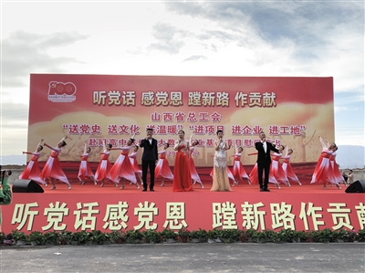 据悉,为把党的关怀送到一线职工身边,从7月至9月,省总工会以“听党话感党恩 蹚新路作贡献”为主题,在全省范围内开展“送党史、送理论、送文化”“进项目、进企业、进工地”活动。9月27日至28日,省总工会慰问演出团在我市阳高中联绿色大数据产业基地项目工地、山西大同大学北校区建设工地等慰问演出,并送上慰问金。
