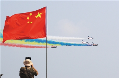 ▲9月28日,中国空军八一飞行表演队在第十三届中国国际航空航天博览会开幕式上进行飞行表演。