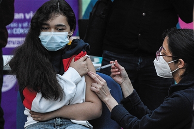 9月27日,一名儿童在智利首都圣地亚哥的普罗维登西亚学校接种科兴新冠疫苗。