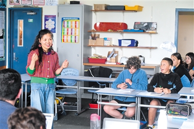 9月27日,在新西兰首都惠灵顿的埃文斯湾初级中学,中文老师在给学生上中文课。