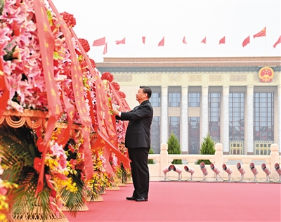 9月30日上午,党和国家领导人习近平、李克强、栗战书、汪洋、王沪宁、赵乐际、韩正、王岐山等来到北京天安门广场,出席烈士纪念日向人民英雄敬献花篮仪式。这是习近平整理花篮上的缎带。 新华社发