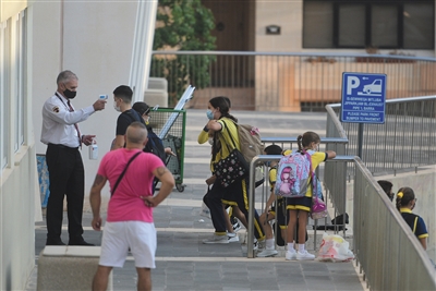 ◀ 9月29日,在马耳他彭布罗克市,学生们进学校前接受体温检测。