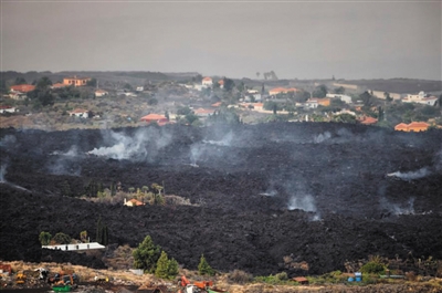 西班牙拉帕尔马岛的老昆布雷火山喷发9天后,熔岩9月28日开始流入大西洋。熔岩所过之处一片焦黑,近600幢房屋和多处香蕉种植园被摧毁。