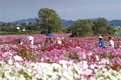 近日,安徽省黄山市歙县郑村镇“四月乡村”现代休闲农业产业园的波斯菊竞相绽放,吸引游客徜徉其间。近年来,歙县郑村镇依托良好的生态环境、历史文化、特色农业等资源,融合文化、旅游和农业多要素,发展现代休闲农业,推进乡村振兴。