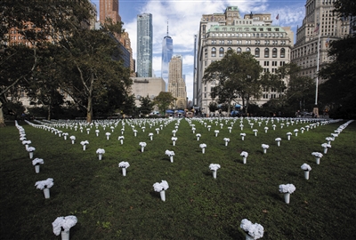 这是10月8日在美国纽约炮台公园内拍摄的为悼念枪支暴力遇难者摆放的白色瓶花。