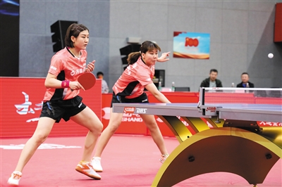 图为山东鲁能队选手陈梦(左)/陈幸同在双打比赛中。