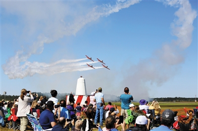 ◀ 10月16日,观众在美国路易斯安那州哈蒙德市观看飞行秀。