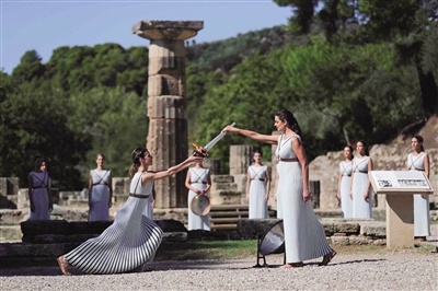 当日,北京冬奥会火种在奥林匹克运动的发祥地——希腊伯罗奔尼撒半岛的古奥林匹亚采集成功。在有着两千多年历史的赫拉神庙遗址前,奥运火种再次为北京点燃。 新华社发