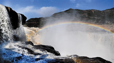 当日,雨后初霁的黄河壶口瀑布出现“彩虹飞瀑”景象。