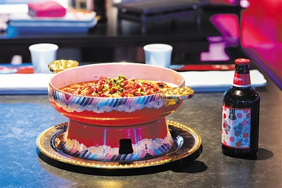 九尾狐是《山海经》中的神异动物,常用来象征祥瑞,后简称“九尾”;令者,美好。进得店来,满眼的中国红。首先映入眼帘的是一个极具中国风的大门,铜制狮钉门环让人有穿越之感;灯光修饰出来的各种纹样五彩斑斓,营造出雕梁画栋的氛围;这边是戏剧里的花旦,妩媚动人;那边的“贵妃”却戴着墨镜,顽皮可爱。“中国+潮流”,原来竟如此动人。就连餐桌上摆放的一次性筷子,其外包装也是中国红底色上印着生动活泼的花旦、刀马旦,分外惹眼。服务员则戴着狐狸面具,平添几分神秘。墙面上用灯带做出的字样装饰更加引人注目:“朝酒晚舞”“有肉同长”“聚众开燥”“情深如戏”等等,张扬、浮夸、戏谑,一种酣畅淋漓的洒脱撩动着人的心弦……