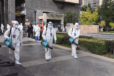 ▲10月20日,工作人员对因疫情封控的兰州市安宁区倚能黄河家园小区进行全面消杀。