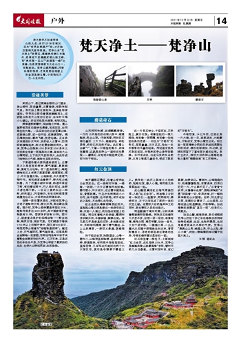 我之前并不知道梵净山的大名,自打2018年被认定为“世界自然遗产”后,才开始注意相关宣传报道。梵净山由“梵天净土”而得名,雄踞贵州铜仁市境内,是绵延千里巍巍武陵山脉主峰,有“贵州第一名山”“武陵第一峰”之美誉,也是我国佛教五大名山之一,弥勒道场。梵净山雄浑巍峨、风姿仙骨的特质,尤其是那座绝壁上的金顶直插云霄,令我惊叹不已、心生向往。
