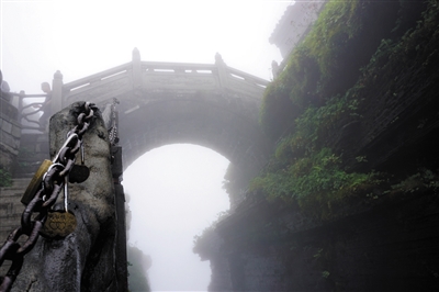 终于临近金顶,抬眼望去,山峰一劈为二,从峰顶直至峰腰,遂成双峰对峙,断崖陡绝,似两根手指高高竖起,直指苍穹,又似写在天地间的两个大大惊叹号,莫非是夸赞勇于攀登之人。狭窄的一线天上架有小小的拱桥,险峻壮观,摄人心魄,将同根兄弟紧紧连在一起。