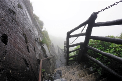 红云金顶从峰脚到峰顶近百米,直挺挺山峰上硬是凿出一条狭窄的石路,仅容一人通过,犹如挂在绝壁上的天梯。两边系着粗大的铁链,攀爬时须手脚并用,手握铁链,脚踩石窝。有几段几乎是垂直的石阶,身体悬在空中,耳畔凉风飕飕,脚下雾气腾起,头上山泉滴答,一旁百丈悬崖,甚感惊险。