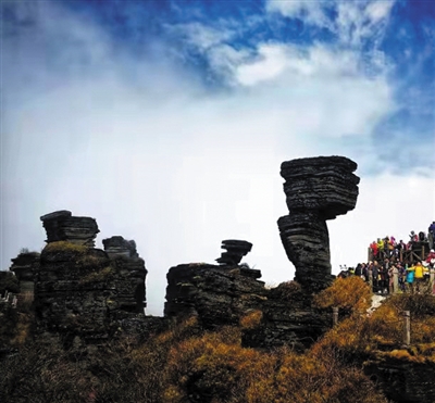 山风阵阵吹拂,岚烟飘飘渺渺。一方约10米高的岩石闯入眼中,雄健挺拔,屹立山顶。仔细再看,两块巨石错位叠加,上大下小,摇摇欲坠,奇险异常,然而亿年岿然不动。此石看上去像“7”,又像一只倒挂的靴子,却神似蘑菇,这就是梵净山一道标志性景观——蘑菇石,在电视中能经常见到,而今终于相会。