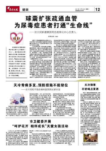 据悉,近年来,大同新建康医院血液净化中心先后开展了多例血管通路维护,受到患者及其家属称赞。目前,中心已成功开展的项目有插临时管、插长期管、自体动静脉内瘘的建立等。对于内瘘狭窄、闭塞、血栓形成、动脉瘤、感染等并发症处理具有丰富的经验。今年新开展的药物球囊技术治疗动静脉内瘘狭窄,在为广大血液透析尿毒症患者的“生命线”保驾护航的同时,也标志着大同新建康医院血液净化中心血管通路技术再上新台阶。