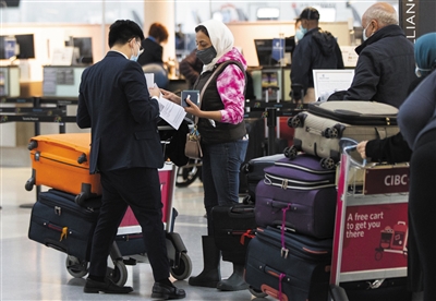 10月30日,在加拿大米西索加的多伦多皮尔逊国际机场,一名旅客向工作人员出示完全接种新冠疫苗证明。