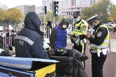 11月1日,交通警察在海淀区中关村大街进行电动自行车车辆信息核查。