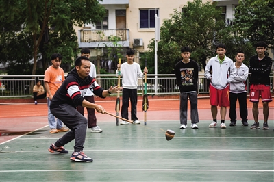 11月4日,在广西崇左大新县民族高级中学,体育老师给学生演示打陀螺。