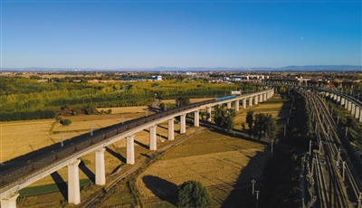 运煤专列行驶在呼和浩特境内(10月15日摄,无人机照片)。
