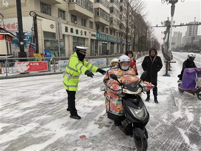 本报讯 (记者 刘剑) 昨日,市公安局交警支队全员上路执勤,强化路面管控,科学疏堵保畅,加强辖区重点路段的交通安全管理,全力做好雪天道路交通安全管理工作。