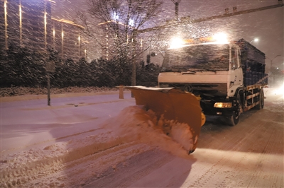 大功率、多功能的铲雪车,当仁不让地成了此次除雪的“主角”。其后的融雪剂撒布车则在铲雪车的推雪铲将厚雪推薄后再均匀地撒上融雪剂。滚刷车也不简单,它能迅速清除马路上的雪并将雪堆积起来,然后利用抛雪机再将雪甩到一旁,让路上的积雪迅速“搬家”。由于这次降雪量大、持续时间长、温度低,为防止夜间降温结冰影响周一早高峰的交通,重点道路全部实行重复撒融雪剂。