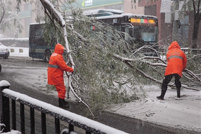11月7日,环卫工人在山东省济南市黑虎泉西路上清理断裂的树枝。