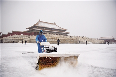 11月7日,工作人员在北京故宫扫除冰雪,保障游客安全。