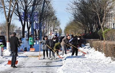 图为恒安街北侧,责任单位员工正在清理积雪。 本报记者 张占兵 摄