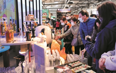 11月8日,顾客在进博集市内一处各国商品集中展示台前选购。