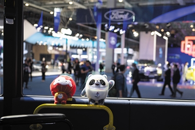 11月7日在第四届进博会汽车展区拍摄的“冰墩墩”和“雪容融”。