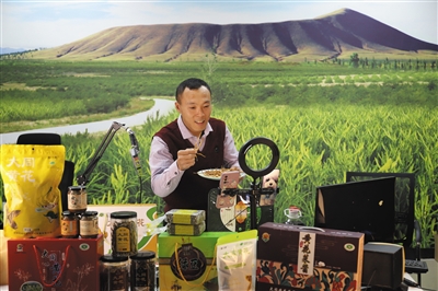 “双11”期间,直播带货也成为电商平台销售产品的标配。在抖音、西瓜视频、百度、今日头条等多个平台拥有近70万粉丝的云州区电子商务公共服务中心的网红直播吴学军,这几天忙得不亦乐乎。记者在他的直播间看到,吴学军正对着手机在各大平台销售大同黄花系列产品,不大的直播间放满了黄花、小米等“大同好粮”。在推荐大同黄花时,吴学军先拿起包装袋展示,再拿出黄花介绍展示,然后招呼粉丝秒杀。