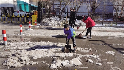 提起9日那天清理积雪的事儿,袁改文告诉记者,当时她们为在附近开商铺的姐姐清理完门前积雪后,看到马路积雪多,且随着气温回升,部分雪已融化,道路泥泞难行,于是母子俩就拿起铁锹清理道路积雪。主要是为行人方便通行,当然也有儿子喜欢劳动的因素,她觉得这就是很普通的一件小事。
