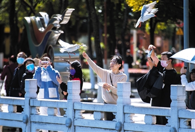 近日,云南省昆明市阳光明媚、景色宜人,市民纷纷来到翠湖公园观赏前来越冬的红嘴鸥。