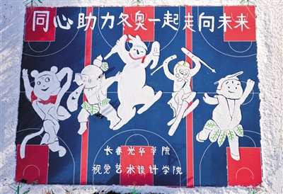 近日,吉林长春迎来降雪天气。长春光华学院视觉艺术设计学院的100多名师生利用课余时间在学校篮球场上绘制1680平方米的创意“雪画”,绘画以“同心助力冬奥,一起走向未来”为主题,为北京冬奥会助力。图为,11月11日拍摄的创意“雪画”(无人机照片)。 新华社发