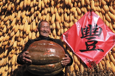 ◀11月13日,临沂市沂南县铜井镇竹泉村村民在展示收获的南瓜。