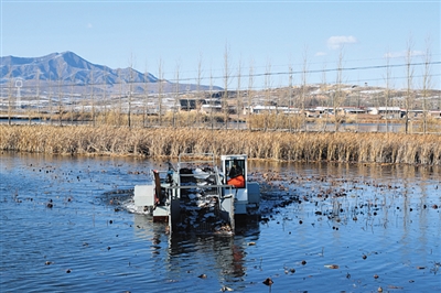 本报讯 (记者 辛雅君) “往年全部靠巡护员坐船使用镰刀收割清理,费时费力,现在有了水草收割机,效率明显提升。”连日来,在神溪国家湿地公园的湖面上,一艘大型水草收割船在湖面来回穿梭,收割着湖面荷花的残枝败叶。