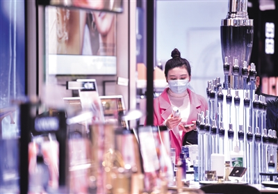 11月14日,消费者在重庆江北观音桥商圈一商场内选购化妆品。