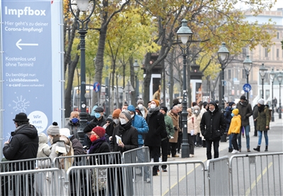 11月15日,市民在奥地利维也纳市政厅前的新冠疫苗接种点排队等待接种新冠疫苗。